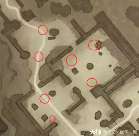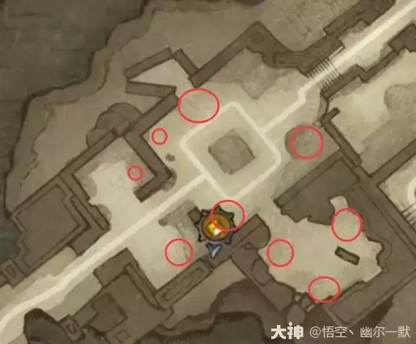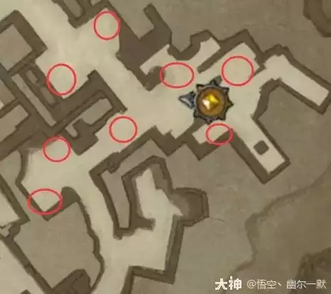 更新后的鬼娃打野不建议去打小祭坛那一圈了4个人两个囚笼碎片附近即可,注意我特别标记出4号和1号的距离要注意,4号站中间打两波如果吃不到1号的经验就麻烦了,要注意距离。