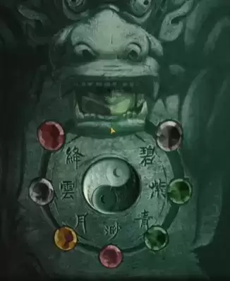 12、切换女性视角,机巧阁龙头上面宝石颜色如下图,得到玉印,千书阁桌上有印泥,获得印泥玉印,屍解居门联缺少了一个字,把它盖在屍解居右边的门联上,获得猴子雕像。