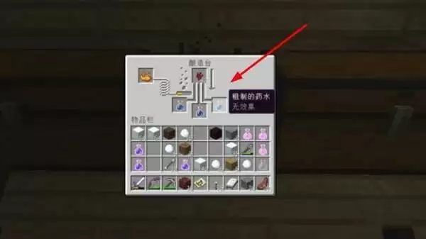 6、打开酿造台,左边放烈焰粉,下面放三瓶水,上面放粗制药水。