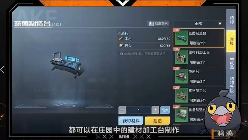 在庄园的【建材加工台】前,幸存者可以制作搭建庄园外部所需的建筑材料,以及装修庄园内部要用的成品家具。
