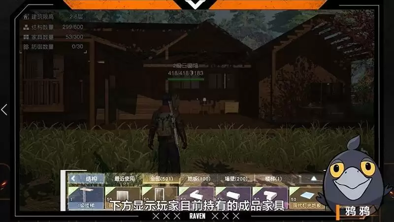 进入建造模式后,屏幕左上角会显示庄园的建造总分、建筑限高、结构数量、家具数量、防御数量等相关参数