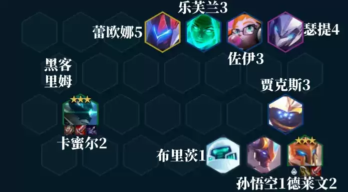 阵容组成:孙悟空、瑟提、蕾欧娜、德莱文、卡蜜尔、贾克斯、佐伊、乐芙兰、布里茨
