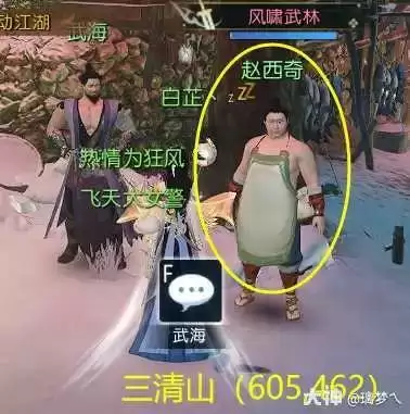 3、如果【阿凉】头顶出现黄色字体,即可前往三清山(652,526)