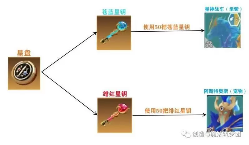 使用50把苍蓝星钥打开星盘获得坐骑,使用50把绯红星钥获得宠物。