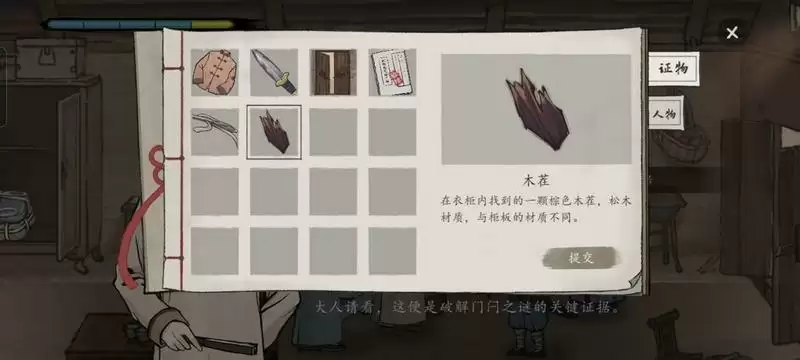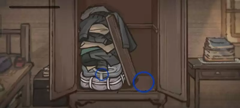 在点击布条后上方堆积的衣物会被移除,露出来第三个证据:断掉的木茬
