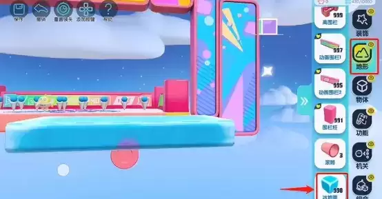 1.在地形里找到冰面,先用圆柱体和冰面搭配一下,把冰面绑定到圆柱体上,再给圆柱体添加运动器,多复制几块相同的冰面,记得设置存档点;