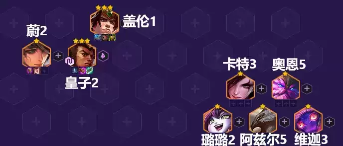 阵容组成:盖伦、蔚、皇子、卡特、奥恩、璐璐、阿兹尔、维迦