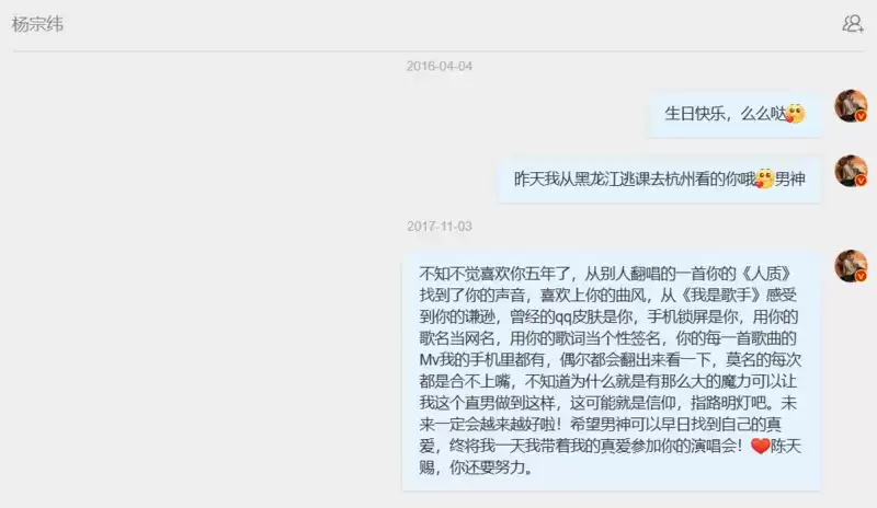 之后的两人私下时常畅聊,微博也互动不断,2022年的平安夜,杨宗纬在美国拉斯维加斯开启个人演唱会,天赐由于工作原因未能前往,但出于对偶像的热爱,天赐全网召集能够去到演唱会现场的粉丝,自费组建应援团为偶像打call,杨宗纬也在演唱会中多次提及并感谢天赐,两人的情谊越发深厚。