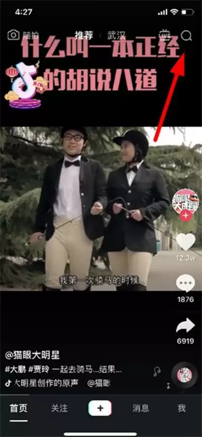 1、首先我们打开抖音,然后点击右上角的【放大镜】图标。