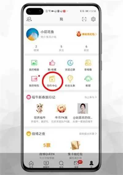 1、我们点开手机中的微博然后点击【创作中心】。