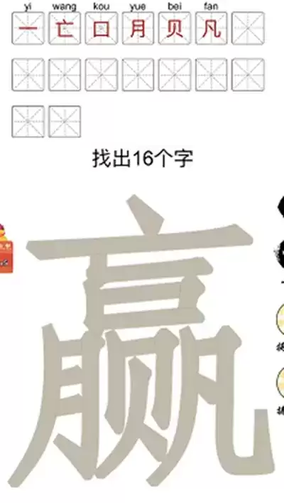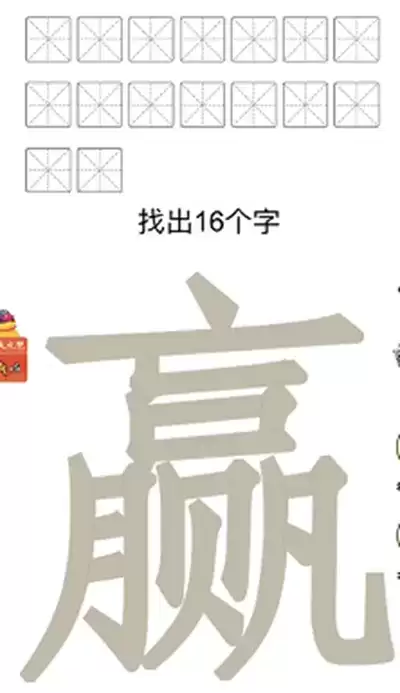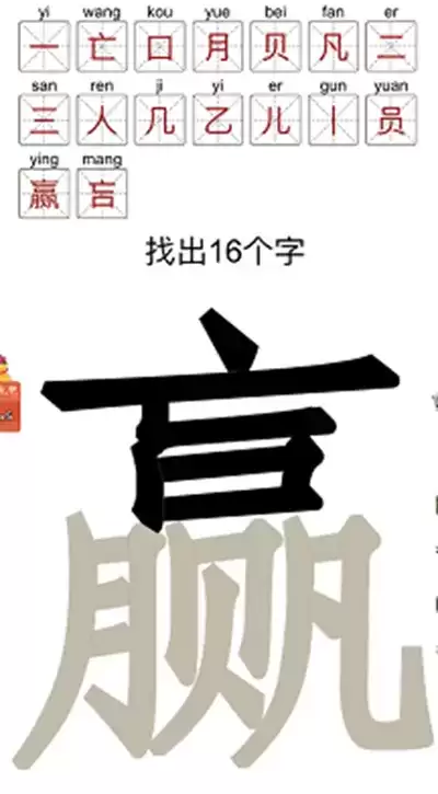赢找出16个字是汉字十八变中新推出的一个关卡,玩家们想要通过这一关就需要从“赢”字上面找出16个字才可以,可能很多小伙伴还不知道这一关应该怎么过,那么今天小编就把通关攻略给大家分享一下吧。