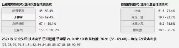 如图所示,在非钛晶化的情况下子弹拳是确定2次击杀,而常规配置的铁包袱并不能打的赢巨钳螳螂。同时在巨钳螳螂使用钛晶刚的情况下子弹拳无耐久的铁包袱则是77.8%到93.1,这也意味着踩钉或者被蹭到一点血就进入巨钳螳螂的子弹拳斩杀线。在当前环境下铁包袱和轰鸣月一样面对巨钳螳螂只有换人和交钛晶化的两个选择。