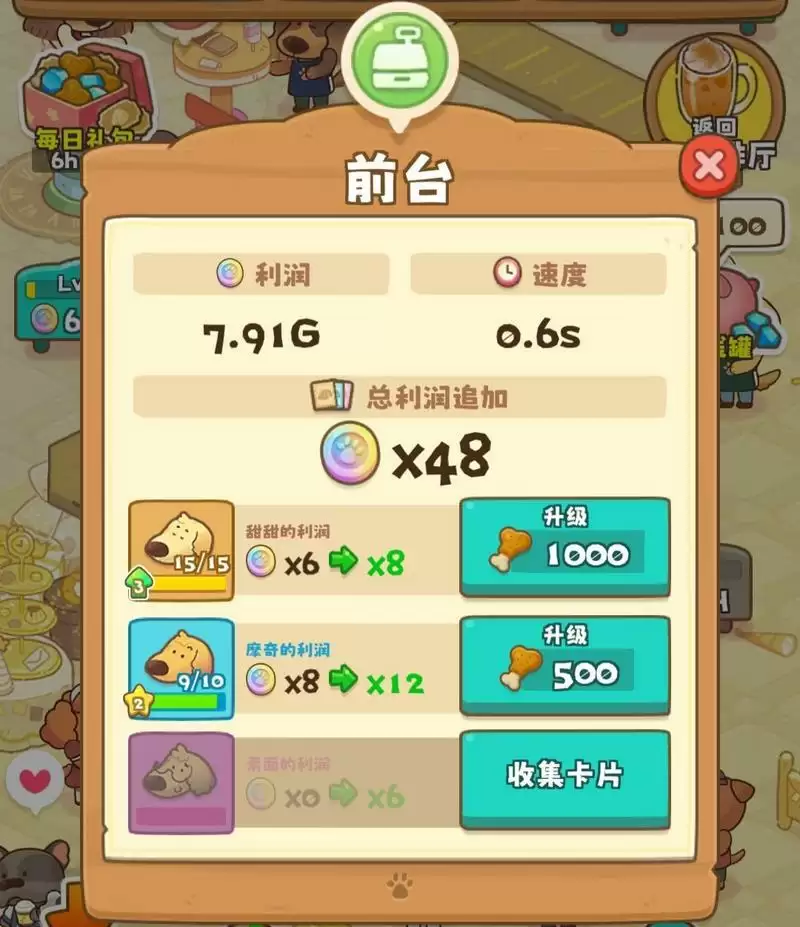 2. 将除了「前台」之外的所有「利润」加起来,也可以只看离「前台」最近的那个单位。例如图中Lv.274「点心站」的15.26G。