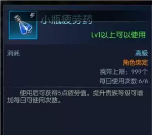 1、小瓶疲劳药:每日可使用6次,每次获得5点疲劳值。
