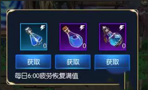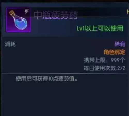 2,中瓶疲劳药:每日可使用2次,每次获得10点疲劳值。