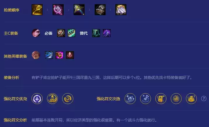 有铲子肯定抢铲子能开9三国尽量九三国,这样后期可以多个c位。其他优先找卡特装备就好了。