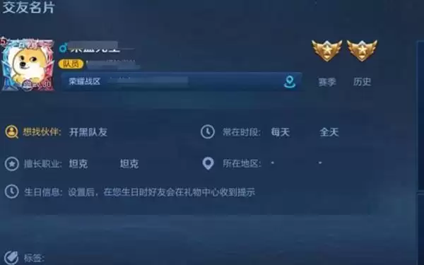 3、在交友名片中我们可以看见自己之前的荣耀战区定位,我们点击后面的定位标志。