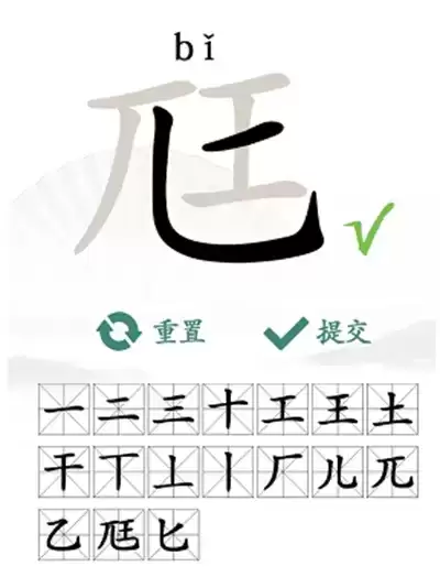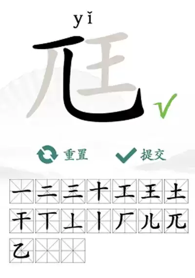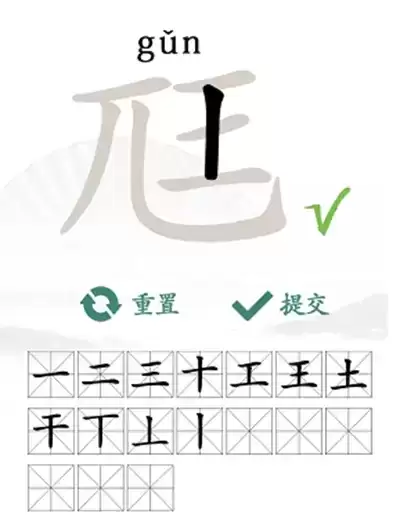 1、关卡答案:【一、二、三、十、干、土、工、丨、丄、丅、王、厂、儿、兀、乙、尪、匕】。