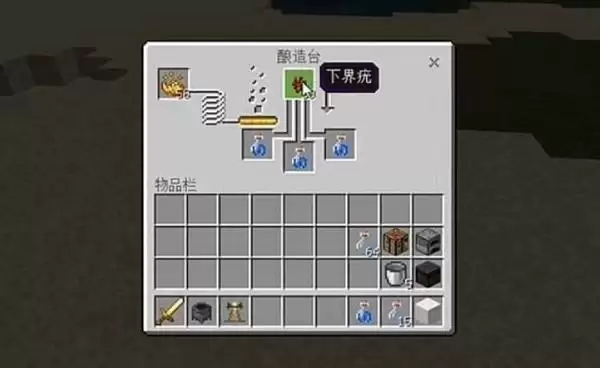 1,首先我们需要找到一个酿造台,然后右键点击进入酿造台;2,接着准备三个瓶子,左边放上烈焰粉,下面放三个水瓶,中间放下界疣,制作粗制的药水;3,接着我们在上方放上闪烁的西瓜片,就可