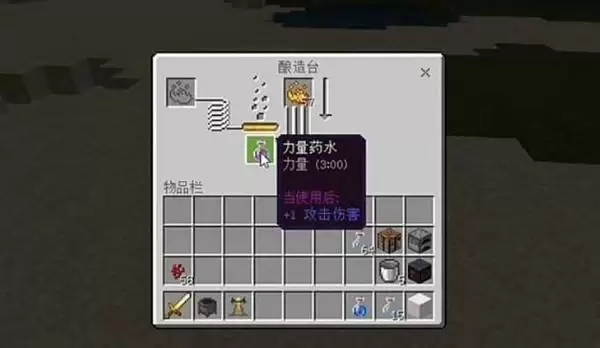 9、我们把下界疣取下来,然后把烈焰粉放到酿造台上方的物品栏,粗制药水就会变成”力量药水“。