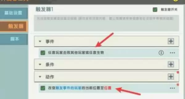 4、然后我们把触发条件设置为不常见时间,动作设置为改变玩家位置。
