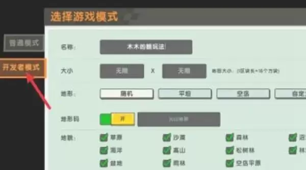 2、我们将新创建的游戏设置为开发者模式,然后地形码填火山地形。