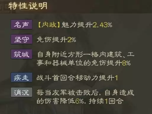 筑城:自身附近方形一格内建筑、工事和器械单位的免伤提升8%