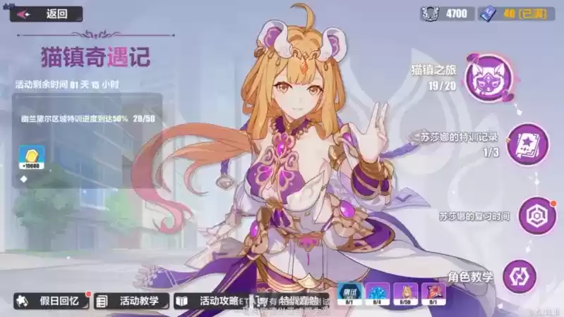 本次活动共分为三个模块,「猫镇之旅」是活动的主线章节;「苏莎娜的特训记录」为闯关关卡,分为三个章节,也是商店代币的主要来源;最后是提升角色能力的模块「苏莎娜的复习时间」,利用闯关中获得的材料提升技能等级和整体属性,减少通关压力。