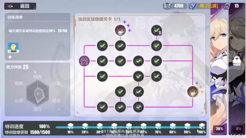 在这里共有三个区域,每个区域都有着对应女武神的特色内容,只有前面区域的特训进度达到100%后才会解锁后续区域。每个区域中都包含有三种不同的关卡内容:战斗课程,知识课程和技巧课程。同样,需要完成当前区域内的前置关卡才可以解锁后续内容。