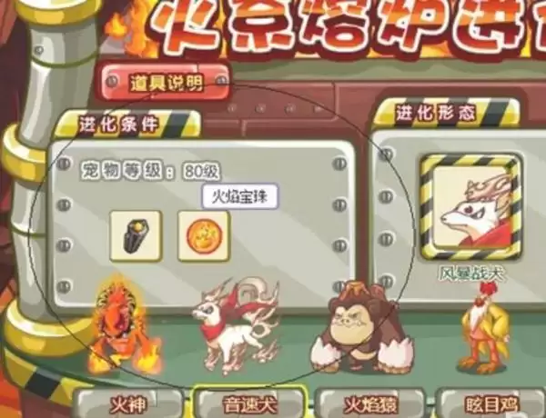 4、接着我们使用【燃料棒】和【火焰保护组】就能让音速犬在维苏威地幔进化为风暴战犬了。