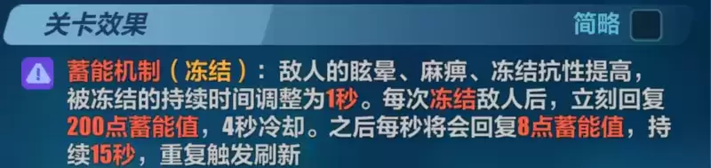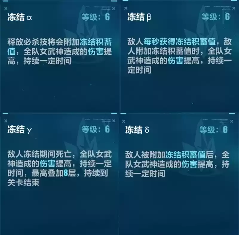 因为在关卡中冻结的持续时间被关卡机制限制到1秒,在冻结期间击杀敌人难度较高,所以不推荐使用γ芯片。仅推荐α(必杀技施加冻结)、β(敌人每秒获得冻结值)和δ(敌人被冻结后获得增伤),这样无论阵容中有没有冻结角色,都可以在战斗中迅速为敌人施加冻结积蓄,从而提升蓄能等级,提高加伤。