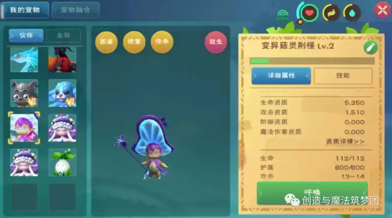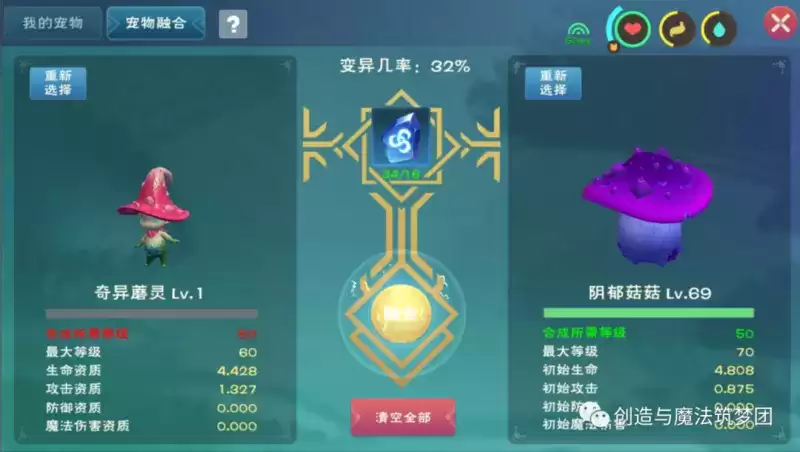资质好的宠物更容易合出资质不错的宠物,而变异能够进一步增加概率,总之就是融合时尽量选择资质较好的宠物,尤其是融合的第四步,奇异蘑灵属性不错的情况下融合还变异的话,那么可6阶菇灵荆怪基本稳了!