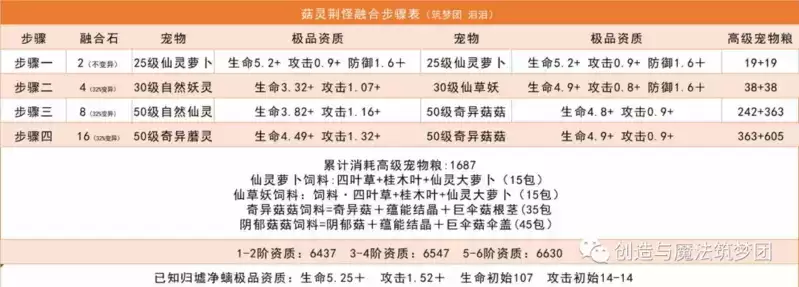 算下来每融合一只菇灵荆怪需要1687包高级宠物粮,相比于其他融合宠物要的经验要低得多的。菇灵荆怪合成表给大家看一看: