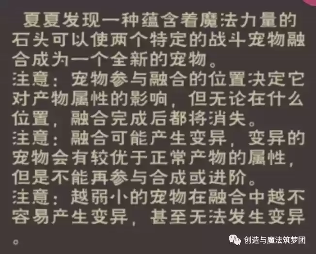 魔法融合石:融合宠物的必要材料,可以通过参加各种副本活动获得兑换币在兑换商店中兑换,其中家园副本是获取效率最高的,只需要每周挑战一次即可最高获得400乐园币,40家园币。菇灵荆怪凝萃:在融合宠物的过程中,战斗型宠物通常会出现变异的情况,变异之后需要修复才能进行融合或进化,而凝萃是修复变异宠物的初级道具。同样是在兑换商店中获取,通过购买基础还童礼盒有概率开出菇灵荆怪凝萃。
