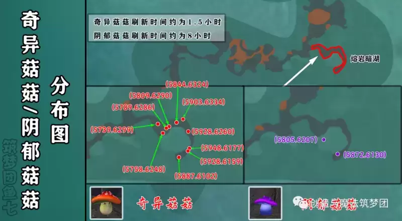 ⚡奇异菇&阴郁菇:奇异菇外形为红色的大蘑菇,阴郁菇外形为紫色大蘑菇,这两种蘑菇主要分布在熔岩暗湖区域,也可以通过击杀奇异菇菇&阴郁菇菇获得。