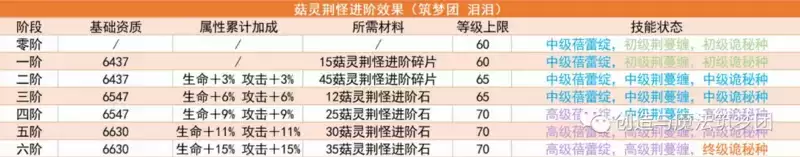 菇灵荆怪分别在2阶,4阶,6阶会有一个明显地提升。2阶三个技能均达到中级,等级上限由60→65级,且只需要便宜的进阶碎片,比较适合平民;而4阶的菇灵荆怪技能、属性都有明显的变化,相当于青春版6阶菇灵荆怪,伤害技能都到达了高级,并且等级上限由65→70级;6阶属性得到更大的提升同时,获得了唯一个终极技能,不过培养费用是4阶的近3倍,看需求进阶