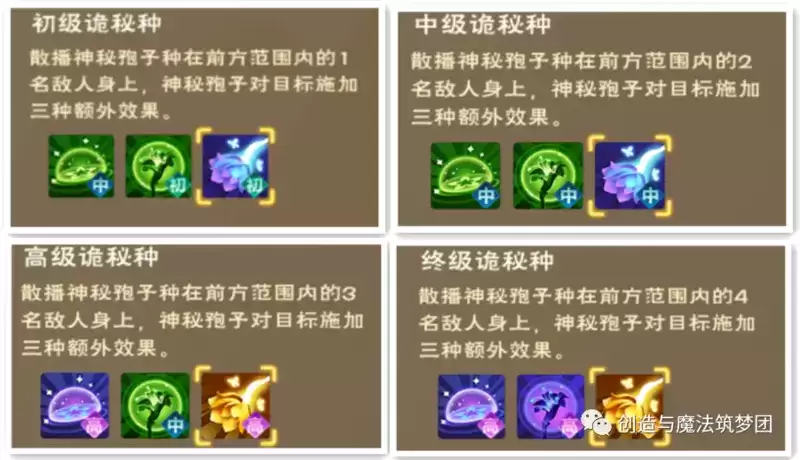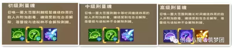 该技能分初、中、高三个等级,效果为菇灵荆怪缠绕禁锢周围敌人1.5/2.0/3.0s,使得敌人不能移动,并附加一层剧毒(可叠加4层),受到玩家攻击时会解除,受到蓓蕾绽及诡秘种伤害时不会解除。