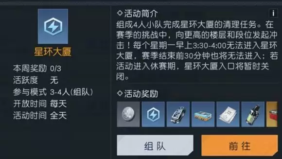 先来看看如何参加星环大厦副本活动。参加方式也很简单,那就是每个赛季中,除了星期一早上3:30~4:00,赛季的最后一天早上0:00—4:00无法进入挑战,其他时间都是可以进行挑战的,比赛方式以PVE形式出现,40级以上的玩家才能参与并且需要组上自己的小队,挑战次数有20次,但是奖励只有三次。