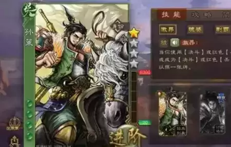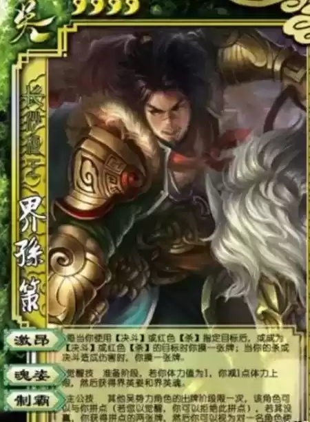1、【激昂】:当孙策使用决斗牌或者是红色的杀牌时,或者是成为敌方使用决斗和红色杀牌的对象时,孙策激昂技能自动触发,你摸一张牌。