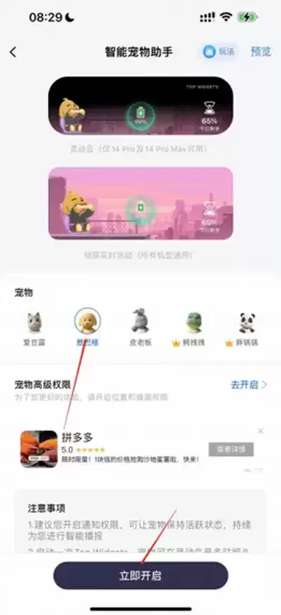 4、接着我们在中间挑选一只自己喜欢的宠物,然后点击【立即开启】。