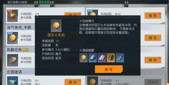 首先来看一下活动,国王火车站作为困难难度的副本,每周仅可获得一次奖励,且为组队玩法。当然了,就算可以一个人参加任务也没法打啊,那么多怪。