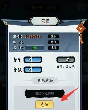 4、进入设置界面以后,点击箭头所指的兑换码界面,输入上述的礼包码点击兑换。