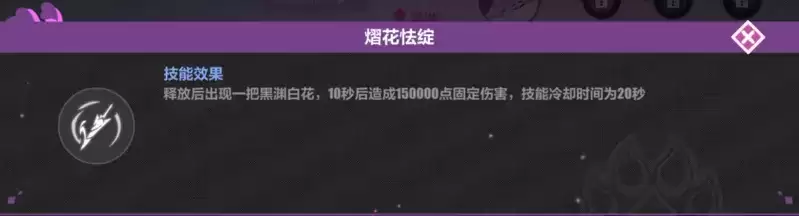 当前关卡的效果为一次延迟爆炸的高额伤害,在使用关卡主动技能前开启武器主动技能(至多三次)可以提高本次黑渊白花爆炸的伤害,所以尽量在使用关卡技能前更多的开启武器技能吧。