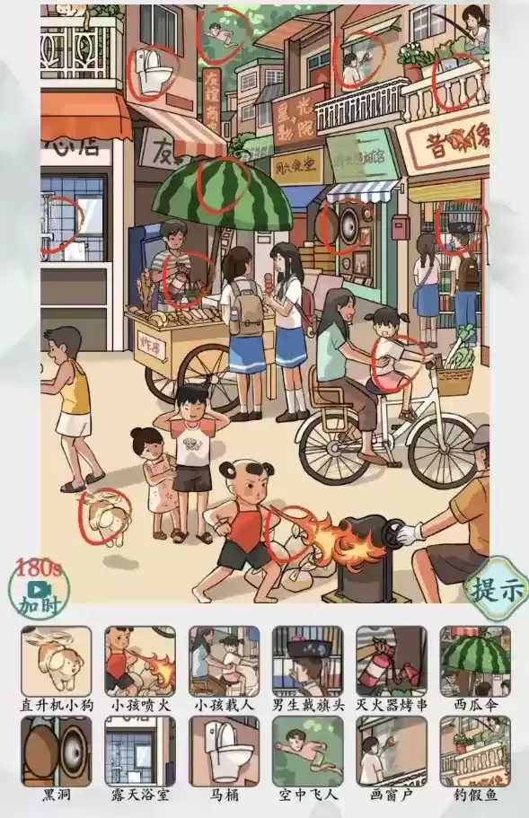 直升机小狗,小孩喷火,小孩载人,男生戴旗头,灭火器烤串,西瓜伞,黑洞,露天浴室,马桶,空中飞人,画窗户,钓假鱼