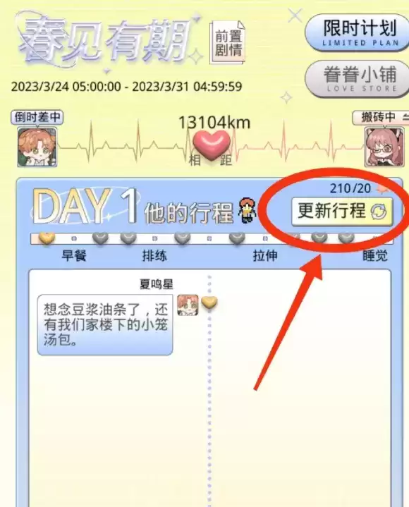 完成*天句读成契后,回到他的行程页面,点击更新行程p4,一直把今天打幸运星消耗完成截止。