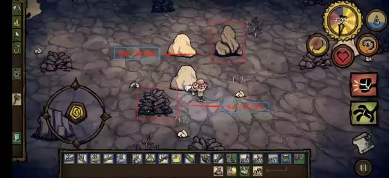 这个时候就是非常重要的一个事情就是找金子,找带金色条纹的石头下图这种,用稿子敲掉,会获得金子,前期尽量收集到10个来。