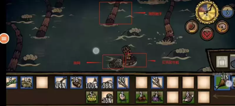 海妖出现后将帆装备拖网的位置,看小地图找到海妖的头然后过去打海妖头,过程中躲避海妖触手,打一下船会掉很多耐久,基本四下船就毁了,人物落水就死了(注意不要打触手,没有用)。