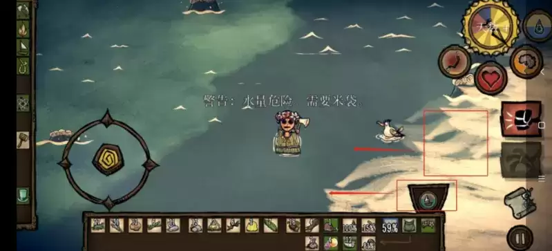 解锁完这些,咱们的背包基本是装不下的,可以将船放水里,把帆和火炬放船上,砍刀以及没有耐久的工具用完或者丢掉。吃的留烤椰子或者烤海带就行。