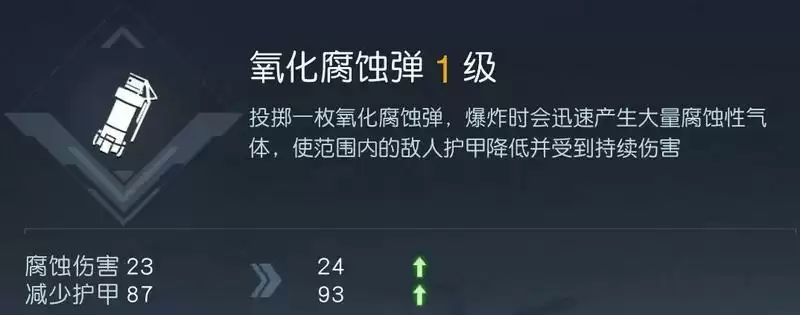 技能效果:投掷后迅速爆炸,产生大量淡黄色气体烟雾,对范围内的敌人造成少量腐蚀伤害,但是减少敌人的大量护甲。