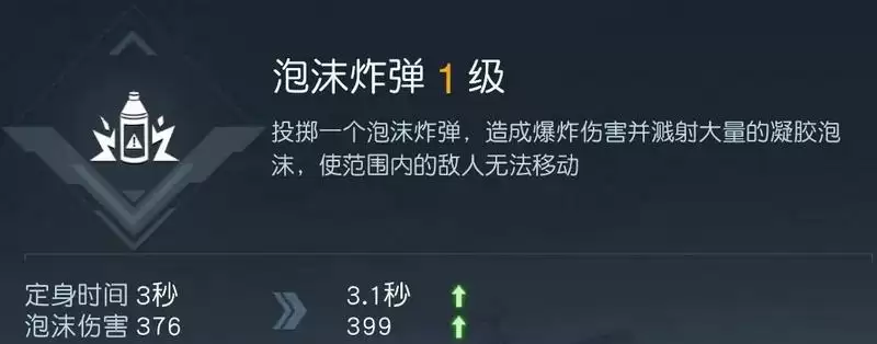 技能效果:投掷后稍缓爆炸,对范围内的敌人溅射大量凝胶泡沫,造成中等伤害,并使范围内的敌人定身一段时间。